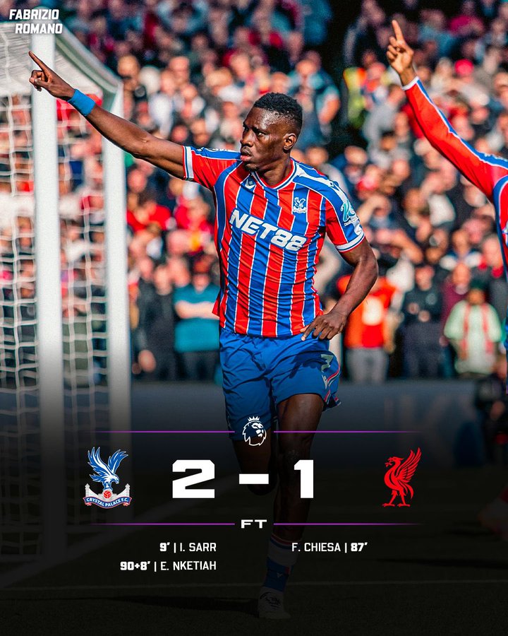 Liverpool ti pàdánù ìbẹ̀rẹ̀ tí kò ní àléébù ní Premier League lẹ́yìn tí wọ́n pàdánù 2-1 fún Crystal Palace ní Ọjọ́ Àbámẹ́ta.